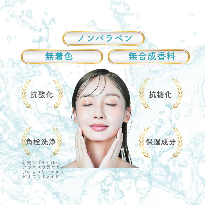 お肌に負担なく毛穴洗浄成分BioDToxの働きで毛穴の奥の汚れを浮き上がらせ スッキリと落とし潤いはお肌にとどめます。