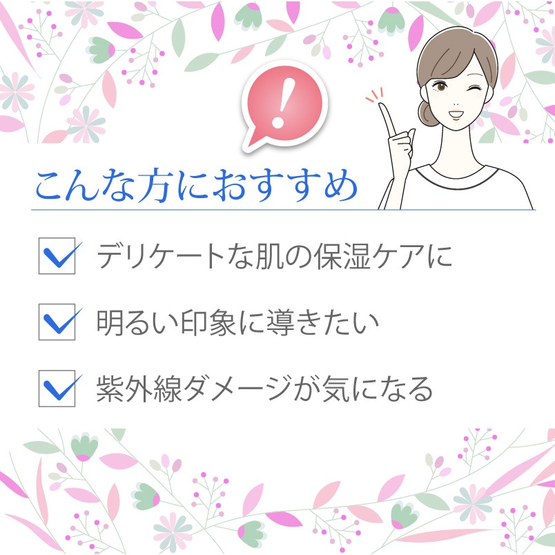 日焼けによるシミ・ソバカスを防ぎ、潤いのあるみずみずしいお肌が持続します。