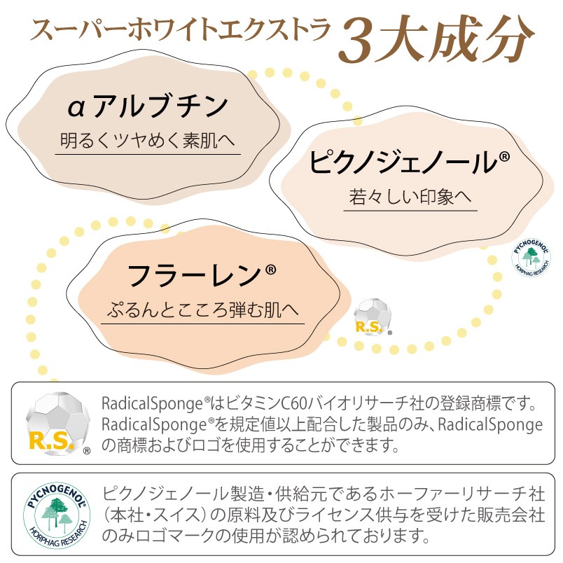 美白成分であるフラーレン、APPS、αアルブチンをぜいたくに配合し、更に透明感、ハリ感を高めるギガホワイト、ピクノジェノールを新配合。