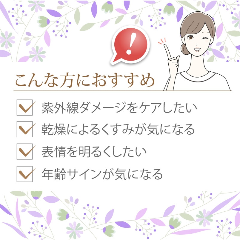 紫外線によるお肌のくすみや気になる部分により集中して働き、輝きを失いがちなお肌にしっかり働きます。