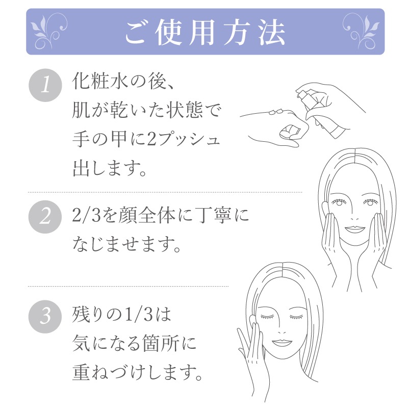 朝・夜、洗顔して化粧水をお使いの後にお顔に優しくなじませます。(3プッシュ)