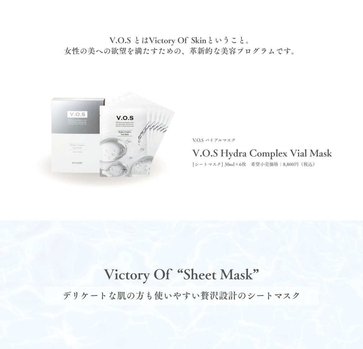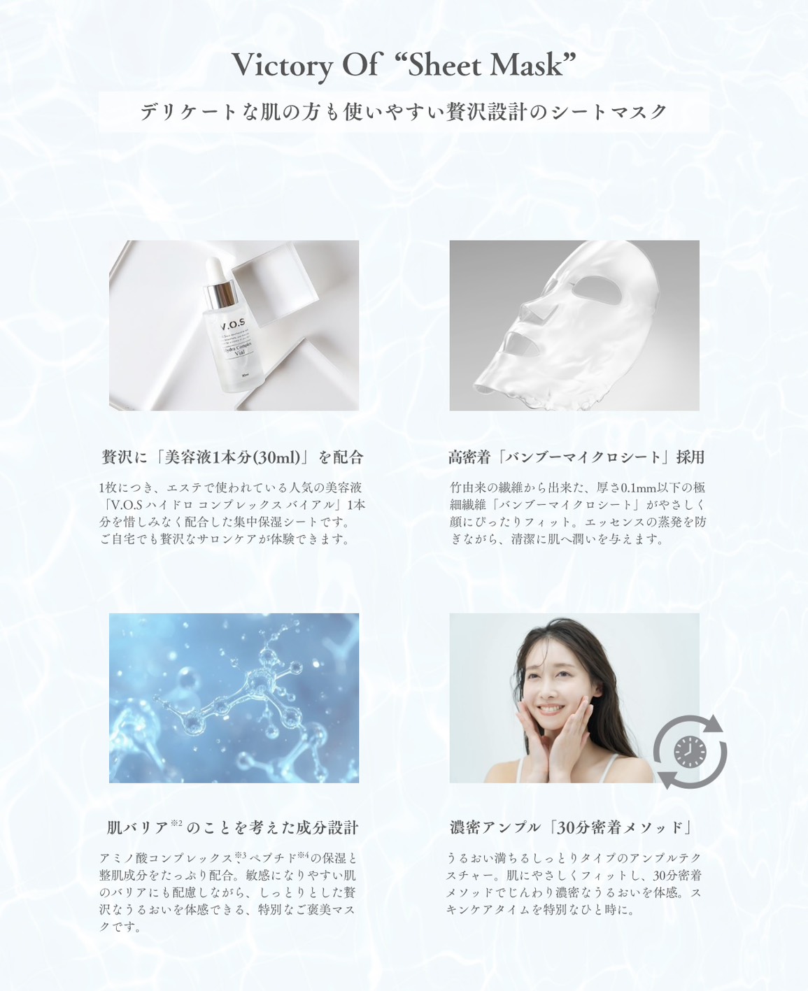 1枚につき、エステで使われている人気の美容液、「V.O.S ハイドロ コンプレックス バイアル」1本分を惜しみなく配合した集中保湿シートです。